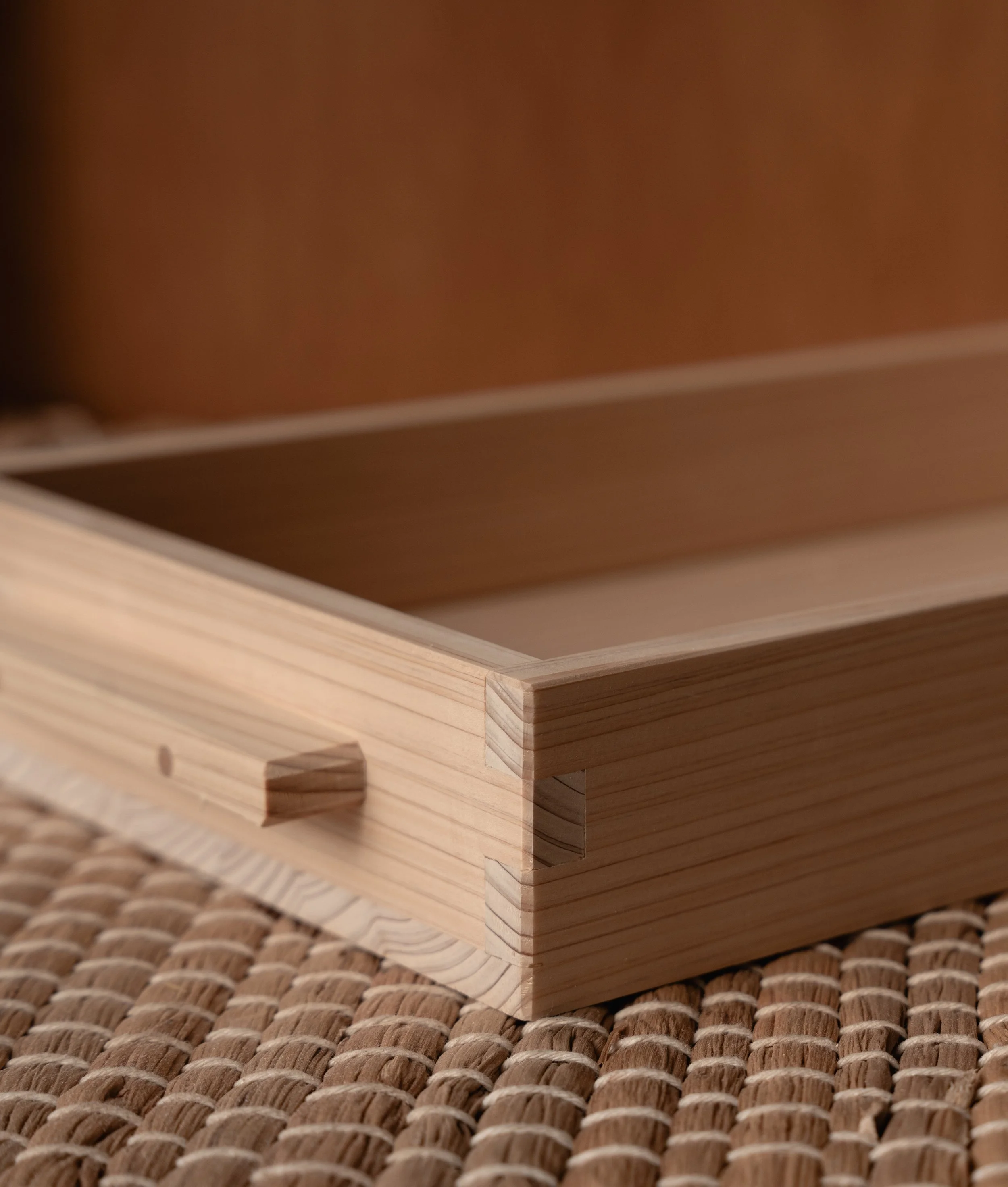 Hinoki cypress is prized in Japan for its light color, fine grain, and subtle natural aroma. It has been used for centuries in temples, bathhouses, and traditional architecture.